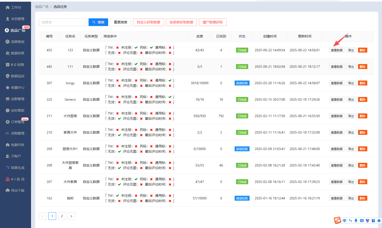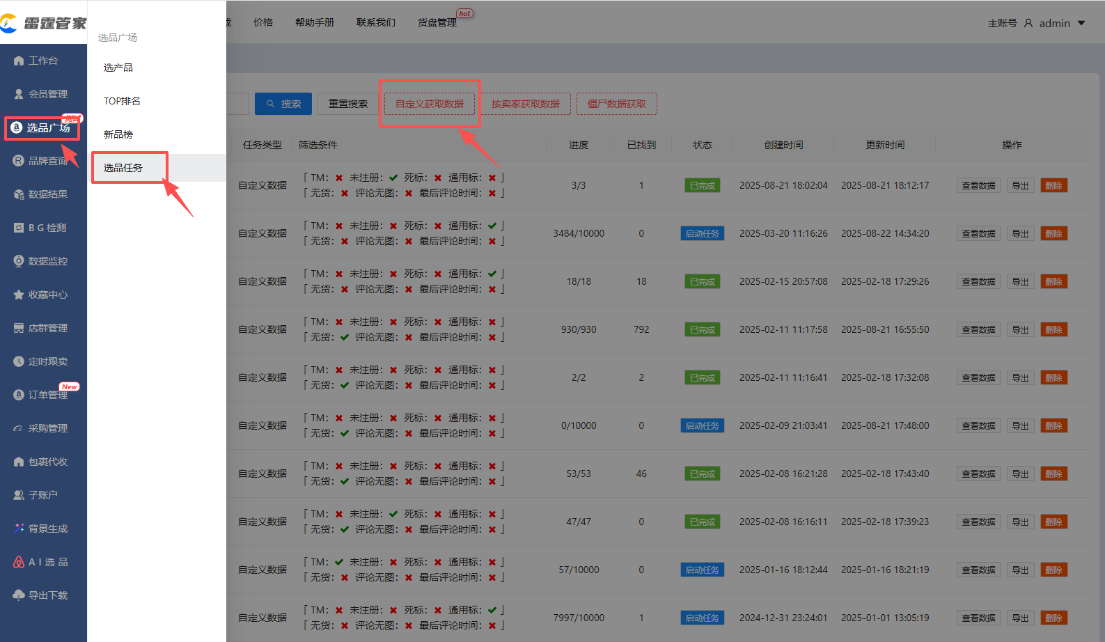 点选品广场—选品任务—可以按照根据自己需求,“自定义获取数据”“按卖家获取数据”“僵尸数据获取”进行过滤条件筛选。如图片↓↓↓